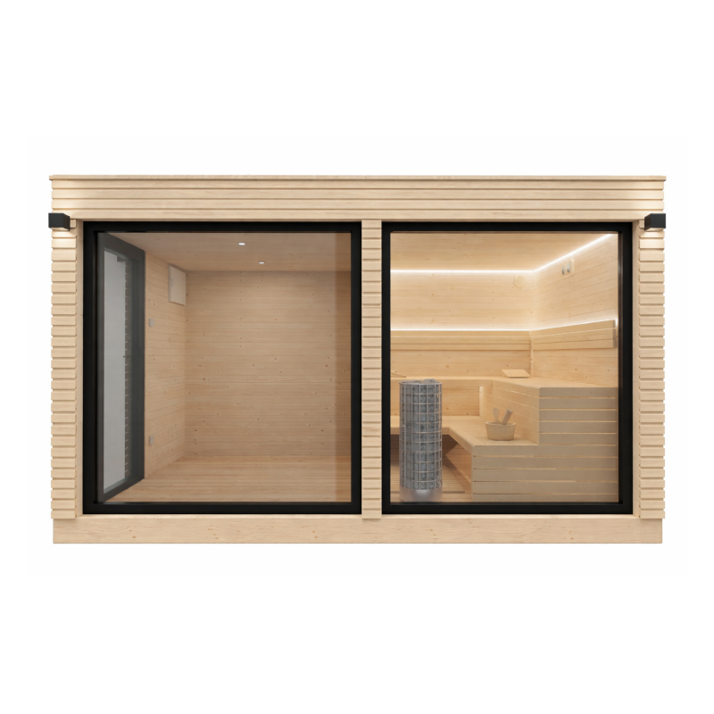Sauna ogrodowa Aengus w wersji Economic to prosta i funkcjonalna konstrukcja do całorocznego użytkowania w ogrodzie. Elewację wykonano z deski typu romb, która nadaje całości nowoczesny wygląd. Wnętrze sauny wykończono boazerią ze świerku skandynawskiego. Z tego samego drewna wykonano ławy i oparcia, co zapewnia spójny charakter wnętrza. Sauna ogrodowa Aengus posiada szklane drzwi wejściowe oraz zespoloną szybę hartowaną w drewnianej ramie. Dzięki temu wnętrze jest jasne i przyjemne. Zastosowany piec elektryczny o mocy 9 kW z wbudowanym sterownikiem umożliwia szybkie nagrzewanie. Dodatkowo pas LED pod ławami poprawia komfort użytkowania. Płyta ogniochronna za piecem zwiększa bezpieczeństwo. Sauna ogrodowa Aengus to ekonomiczne rozwiązanie do prywatnego ogrodu.