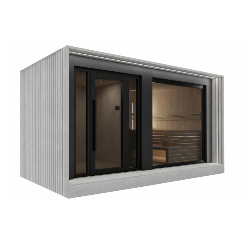 Sauna ogrodowa Baldur w wersji Economic to nowoczesna i funkcjonalna konstrukcja do całorocznego użytkowania w ogrodzie. Elewację wykonano z lameli z termo sosny oraz płyt HPL, co zapewnia trwałość i odporność na warunki atmosferyczne. Wnętrze sauny wykończono boazerią ze świerku skandynawskiego. Z tego samego drewna wykonano ławy i oparcia, dzięki czemu wnętrze jest spójne i komfortowe. Sauna ogrodowa Baldur posiada szklane drzwi wejściowe oraz zespoloną szybę hartowaną w drewnianej ramie. Dzięki temu wnętrze jest jasne i przyjemne. Zastosowany piec elektryczny o mocy 9 kW z wbudowanym sterownikiem umożliwia szybkie nagrzewanie. Dodatkowo pas LED pod ławami poprawia komfort użytkowania. Płyta ogniochronna za piecem zwiększa bezpieczeństwo. Sauna ogrodowa Baldur to praktyczne rozwiązanie do prywatnego ogrodu.