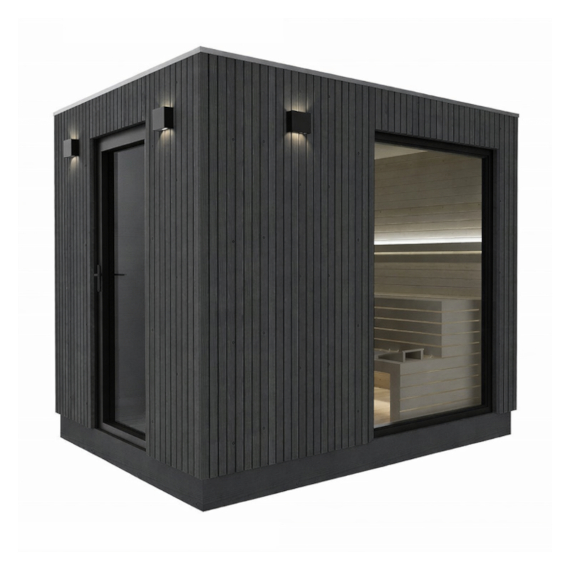 Sauna ogrodowa Brovo w wersji Premium to nowoczesna konstrukcja przeznaczona do całorocznego użytkowania w ogrodzie. Wnętrze sauny wykończono boazerią z termo sosny, co zapewnia trwałość i estetyczny wygląd. Ławy i oparcia wykonano z termo osiki, dlatego korzystanie z sauny jest komfortowe nawet przy wysokiej temperaturze. Sauna ogrodowa Brovo posiada aluminiowe drzwi wejściowe oraz okno FIX w ramie aluminiowej z szybą hartowaną. Dzięki temu wnętrze jest jasne i nowoczesne. Zastosowany piec Harvia Cilindro 9 kW ze sterownikiem FFES zapewnia równomierne nagrzewanie. Dodatkowo pas LED pod ławami i za oparciami oraz płyty kamienne za piecem podnoszą estetykę i bezpieczeństwo. Sauna ogrodowa Brovo to eleganckie rozwiązanie klasy premium do prywatnego ogrodu.