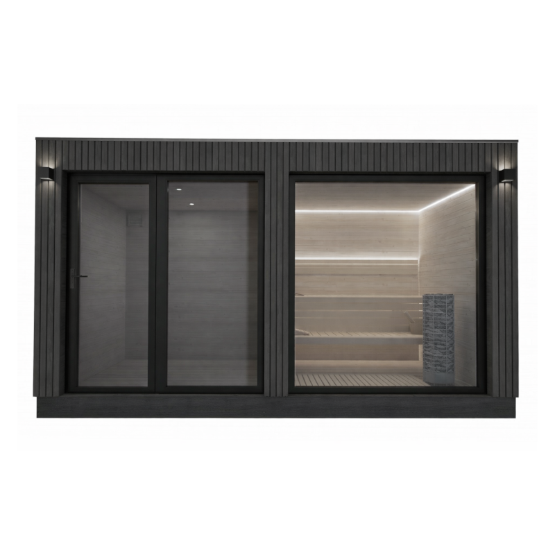 Sauna ogrodowa Epona w wersji Premium to nowoczesna i solidna konstrukcja do całorocznego użytkowania w ogrodzie. Elewację wykonano z lameli z termo sosny, które są trwałe i odporne na warunki atmosferyczne. Wnętrze sauny wykończono boazerią z termo sosny, co tworzy ciepły i naturalny klimat. Ławy i oparcia z termo osiki zapewniają wysoki komfort podczas seansów. Sauna ogrodowa Epona posiada aluminiowe drzwi wejściowe oraz okno FIX w ramie aluminiowej z szybą hartowaną. Dzięki temu wnętrze jest jasne i nowoczesne. Zastosowany piec Harvia Cilindro 9 kW ze sterownikiem FFES zapewnia równomierne nagrzewanie. Dodatkowo pas LED pod ławami i za oparciami oraz płyty kamienne za piecem podnoszą estetykę i bezpieczeństwo. Sauna ogrodowa Epona to rozwiązanie klasy premium do prywatnego ogrodu.
