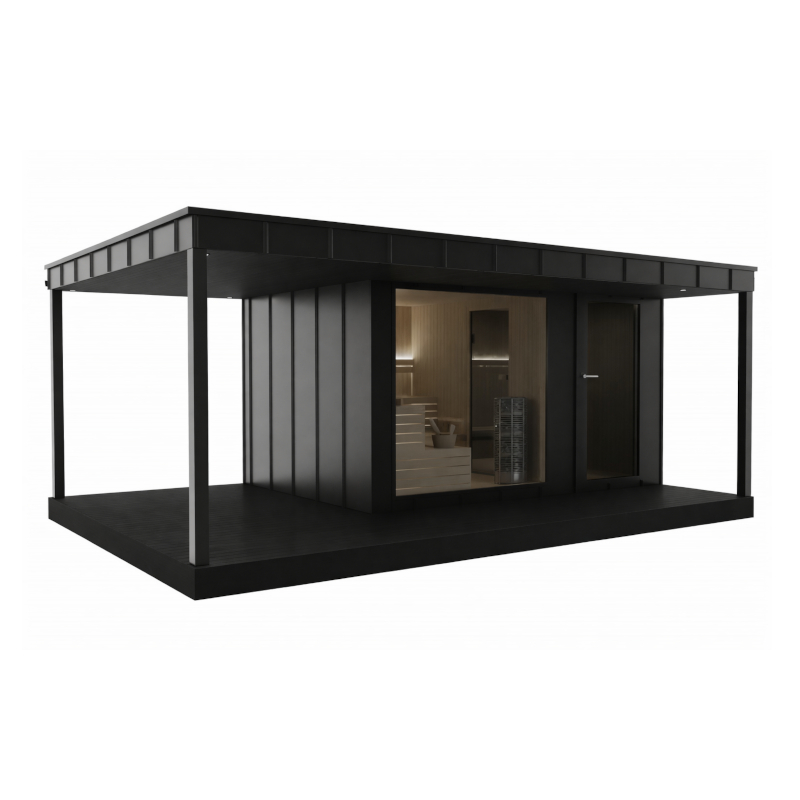 Sauna ogrodowa Esus w wersji Premium to nowoczesna i trwała konstrukcja do całorocznego użytkowania w ogrodzie. Elewację wykonano z blachy na rąbek stojący w kolorze antracytowym, co zapewnia odporność na warunki atmosferyczne. Wnętrze sauny wykończono boazerią z termo sosny, która dobrze znosi wysoką temperaturę. Ławy i oparcia z termo osiki zapewniają wysoki komfort podczas seansów. Sauna ogrodowa Esus posiada aluminiowe drzwi wejściowe oraz okno FIX w ramie aluminiowej z szybą hartowaną. Dzięki temu wnętrze jest jasne i nowoczesne. Zastosowany piec Harvia Cilindro 9 kW ze sterownikiem FFES zapewnia równomierne nagrzewanie. Dodatkowo pas LED pod ławami i za oparciami oraz płyty kamienne za piecem podnoszą estetykę i bezpieczeństwo. Sauna ogrodowa Esus to rozwiązanie klasy premium do prywatnego ogrodu.